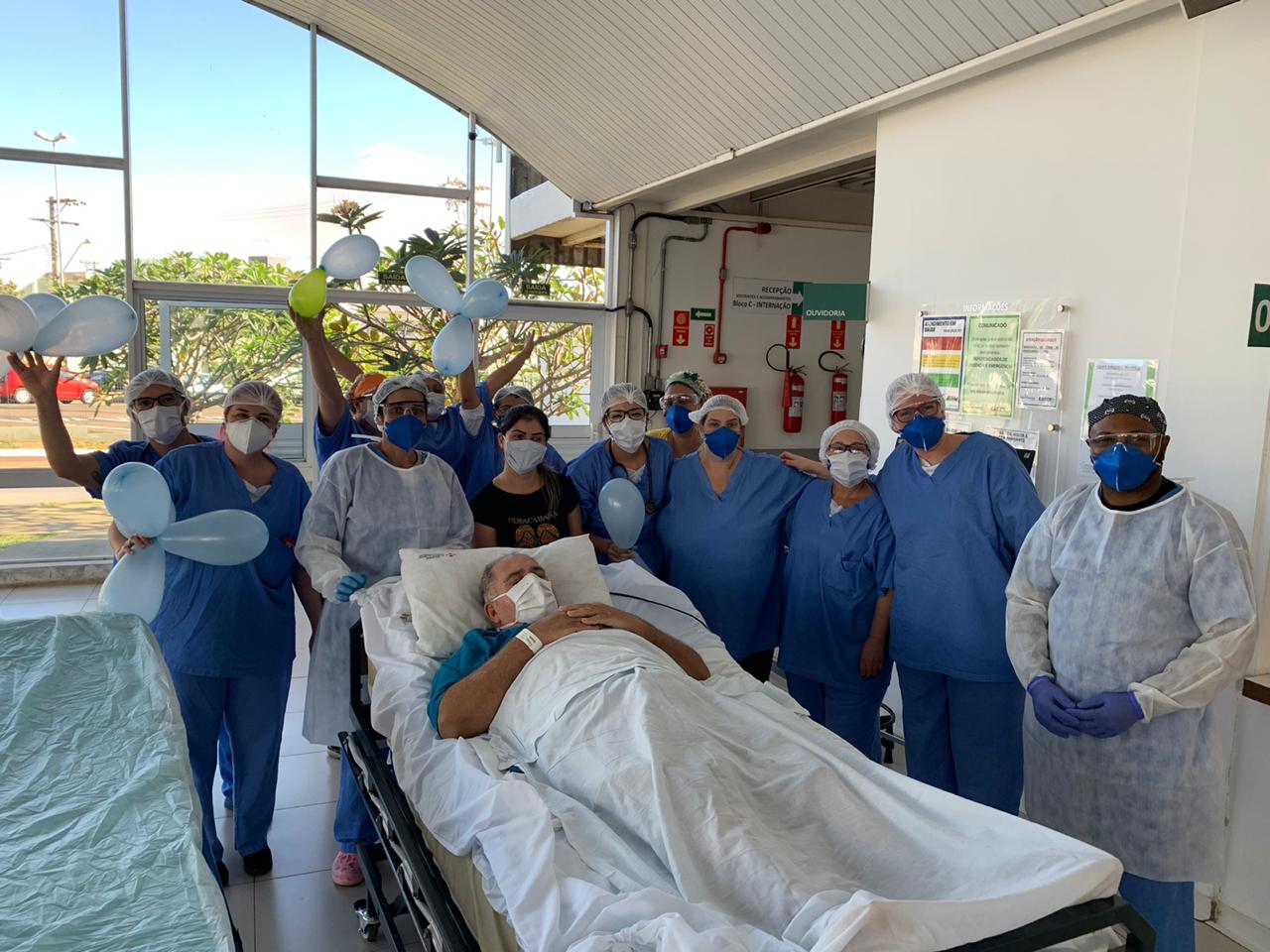 - Paciente teve alta e foi acompanhado por filha e profissionais na saída do HU (Foto: HU-UFSCar)