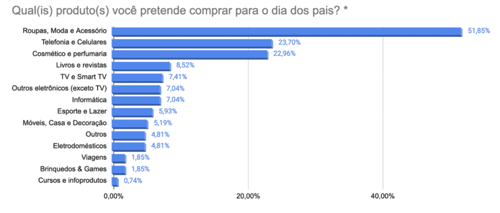 Entre os tipos de presentes para o Dia dos Pais, a maior intenção de compra dos brasileiros é, de longe, itens de vestuário, como roupas e acessórios, com 51,8% da preferência dos entrevistados. Produtos de telefonia e aparelhos celulares aparecem na segunda posição da lista, que estão no plano de 23,7% dos entrevistados (veja lista completa abaixo).