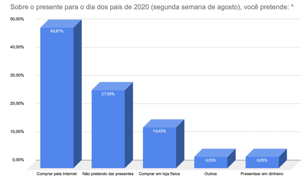 Por outro, a pesquisa da Conversion mostra que quase 30% dos consumidores afirmaram que não pretendem presentear os pais nesta comemoração. Embora o comércio eletrônico tenha ganhado força durante a pandemia, as lojas físicas, por sua vez, fazem parte da escolha de 14,4% dos consumidores para a compra de itens na data.