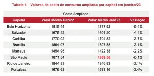 Quando se considera a cesta de consumo ampliada, que inclui bebidas e produtos de higiene e limpeza, além de alimentos, houve um aumento no valor médio em duas, das oito capitais analisadas, e queda em seis. As capitais que apresentaram valores mais altos da cesta ampliada foram São Paulo (R$ 1.869,56) e Rio de Janeiro (R$ 1846,83). As maiores altas no valor da cesta ampliada foram registradas em Fortaleza (0,4%) e Rio de Janeiro (0,1%). Já Belo Horizonte e Salvador registraram as maiores quedas, com -5,4% e -4,4%, respectivamente.